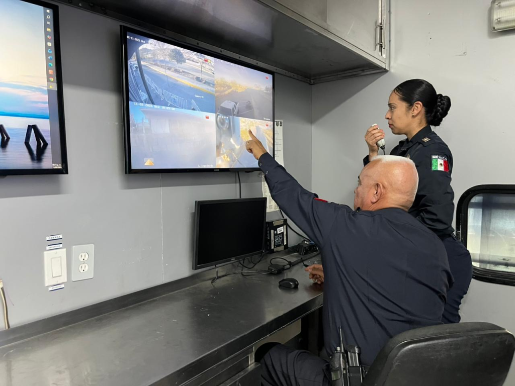 El camión está equipado con un área de trabajo operativo, equipo de cómputo, pantallas de monitoreo en el interior y exterior, espacio de planeación y descanso, además de sanitario. En materia tecnológica, dispone de cuatro cámaras de videovigilancia, una de ellas montada en un mástil que amplía su alcance, todas conectadas a la Plataforma Escudo Chihuahua, lo que permite la vigilancia en tiempo real y la transmisión directa de imágenes al Centro de Monitoreo y Operaciones de la comandancia Norte.