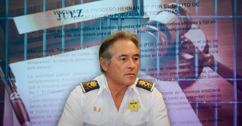 “La Fiscalía General del Estado de Tabasco obtuvo el auto de vinculación a proceso en contra de Hernán “N” por su presunta responsabilidad en el delito de desaparición forzada de personas… (la ley) establece penas de 40 a 60 años de prisión”