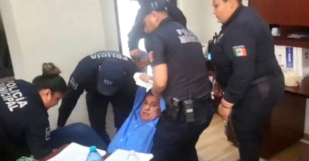 A través de redes sociales se divulgó un video que muestra cómo policías estatales y municipales entran a la oficina de Lorenzo Menera y lo toman de brazos y piernas para sacarlo del Ayuntamiento.
