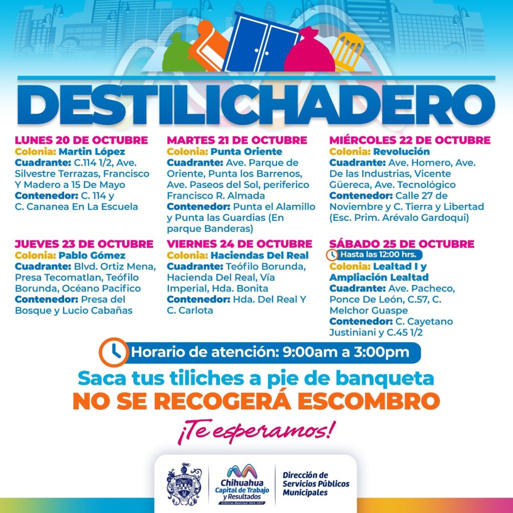 Publicidad H. Ciudad de Chihuahua.- Para evitar acumulaciones de basura de grandes dimensiones en las viviendas, que podría generar plagas o problemas de salud, el Gobierno Municipal, a través de la Dirección de Servicios Públicos Municipales, informa el calendario del programa Destilichadero, que se realizará 20 al 25 de octubre en siete colonias de la […]