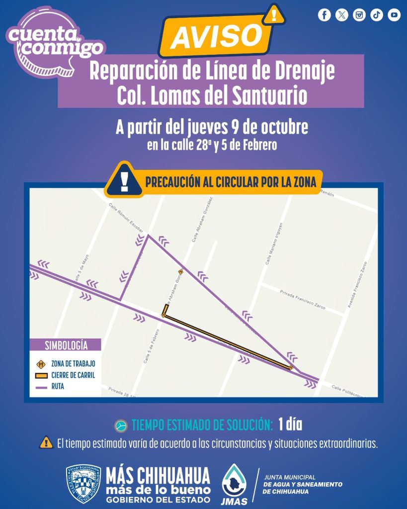 Publicidad La Junta Municipal de Agua y Saneamiento (JMAS) de Chihuahua informó que, este jueves 9 de octubre llevará a cabo los trabajos de reparación de un tramo de línea de drenaje dañada en la calle 28ª y 5 de Febrero, en la colonia Lomas del Santuario. Las maniobras se realizarán en un horario de […]