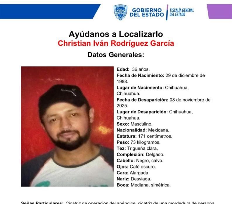 Publicidad La Fiscalía General del Estado solicita la colaboración de la ciudadanía para localizar a Christian Iván Rodríguez García, de 36 años de edad, quien fue visto por última vez el pasado 8 de noviembre de 2025, en la ciudad de Chihuahua. De acuerdo con el reporte oficial, Rodríguez García se encontraba trabajando el día […]