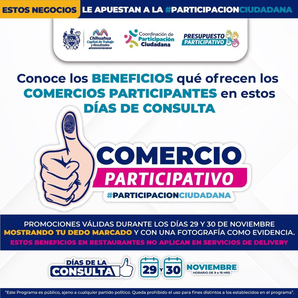 Publicidad Son 26 establecimientos que ofrecerán beneficios especiales este 29 y 30 de noviembre. El Gobierno Municipal informa que 26 comercios locales se sumaron a la consulta del Presupuesto Participativo 2026, para ofrecer descuentos y beneficios a quienes participen en la jornada de votación este 29 y 30 de noviembre, ya sea en urnas o […]