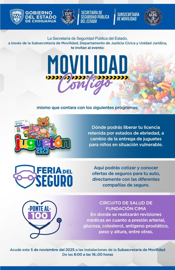 Publicidad H. Cd. de Chihuahua.- La Secretaría de Seguridad Pública Estatal invitó a la ciudadanía al evento “Movilidad Segura”, que se realizará el 5 de noviembre en la Subsecretaría de Movilidad, con actividades enfocadas en la prevención y la cultura vial. Como parte del programa, los conductores sancionados por conducir en estado de ebriedad podrán […]