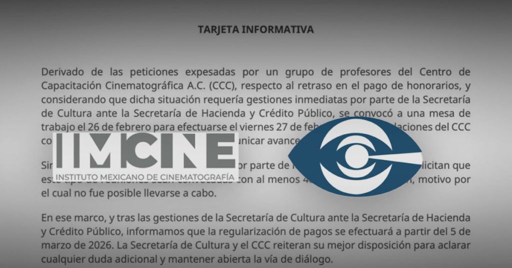 La Secretaría de Cultura, a cargo de Claudia Curiel de Icaza, anunció cuándo se regularizarán los pagos para los trabajadores del IMCINE Y CCC, que no reciben sueldo desde que inició el 2026. Ante la falta de pago, además de un esquema laboral sin contrato y jornadas excesivas, empleados del IMCINE Y CCC convocaron a […]